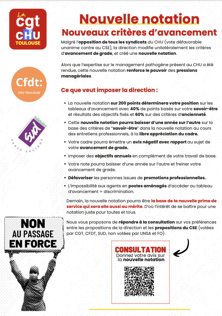 Luttes sur le CHU Contre la mise en place de la nouvelle notation et des nouveaux critères d’avancement par Vince 129 novembre, 20245 décembre, 2024 Répondre au questionnaire : ici Répondre au questionnaire : ici