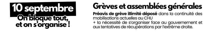 Aout 2025 : Appel aux mobilisations, aux blocages et à la grève pour le 10 septembre ! Préavis de grève déposé au CHU par la CGT pour une durée illimitée. Le 10 septembre sera le commencement, à nous tous de faire grandir ce mouvement, de convaincre, d’alerter, de se mobiliser. Ce jour là, des assemblées générales se mettront en place sur chaque site pour décider de la marche à suivre et de la suite des actions que nous voulons faire. Bloquons tout et organisons nous ! #10S25